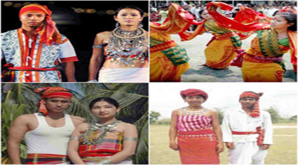 The traditional costume of a male in Tripura is 'rituku' for the loin and 'kamchwlwi borok' for the upper part of the body. Sometime these are topped off by a self-woven shirt, called  Kubai. But however now in urban areas with modernization there are lot of western influence in the costumes. Rinai is a piece of long cloth which is used by the women of Tripura to  drape it around their waist and it goes up to their knee. Risa is considerably a small piece of cloth to that of the Rinai and is used to cover the entire chest area of the body. . The women of Tripura adorn themselves with  plethora of beads and coin strands in their necks. During dance performances the female performers wear a head gear which is made of coronal, made of brass and colored cane,  further embellished with porcupine quills. Green feathers of the parrot`s wings, decorated at their tips, with tussocks of contrasting red wool decorate the upper edge of the quill. They  generally prefer silver ornaments like chains made of coins, bangles, ear and nose rings.